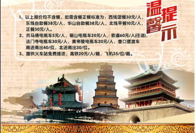 10、立足西安,服務(wù)全國(guó)。西安新旅國(guó)際旅行社位于西安市中心,本公司憑著良好的信譽(yù)、形象、務(wù)實(shí)的工作作風(fēng)和靈活的經(jīng)營(yíng)方式,在競(jìng)爭(zhēng)激烈的旅游市場(chǎng)中逐步發(fā)展,健康成長(zhǎng),并具有自身經(jīng)營(yíng)的特色。同樣的價(jià)格比質(zhì)量;同樣的質(zhì)量比價(jià)格。打造最全旅游產(chǎn)品銷售商,讓游客一站式采購(gòu)使我們的發(fā)展思路。公司遵循:以質(zhì)量求生存、以創(chuàng)新求發(fā)展、以市場(chǎng)為導(dǎo)向、以服務(wù)為宗旨的經(jīng)營(yíng)理念,愿為游客提供全方位、多元化、高層次的服務(wù);愿和各界同仁精誠(chéng)合作,共創(chuàng)美好!